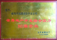 獲獎名稱:省房地產(chǎn)開發(fā)綜合實(shí)力50強(qiáng)企業(yè) 獲獎單位:威海市城建綜合開發(fā)公司 授獎單位:山東省建設(shè)廳