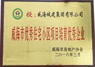 獲獎名稱:威海市優(yōu)秀住宅小區(qū)項(xiàng)目培育優(yōu)秀企業(yè) 獲獎單位:威海城建集團(tuán)有限公司 授獎單位:威海市房地產(chǎn)協(xié)會