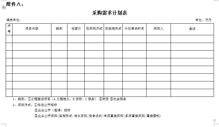 1.年度采購需求計劃表:需求部門(單位)應在本年度12月10日前根據(jù)下一年度的工作任務和工作目標,編制并提報下一年度的《年度采購需求計劃表》;
