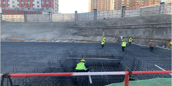 4#樓筏板基礎(chǔ)施工完成,正在綁扎地下2層剪力墻鋼筋及模板支護工作;